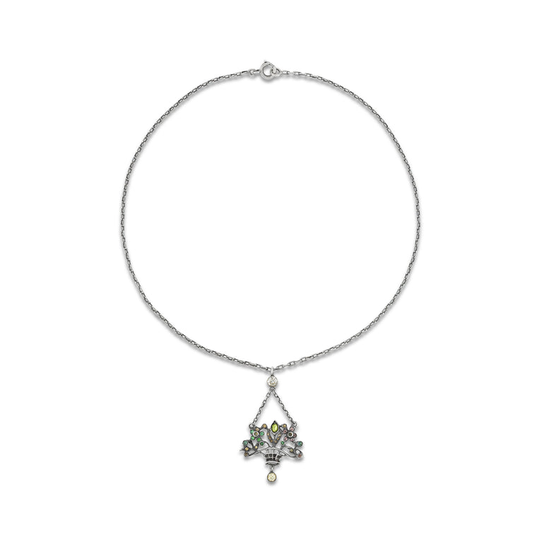 The paste stones outline the basket and its floral contents, each piece carefully shaped and set. This was made to be received as a gift, and worn as a reminder of someone important. It remains very wearable, alone or layered with other favorite necklaces.