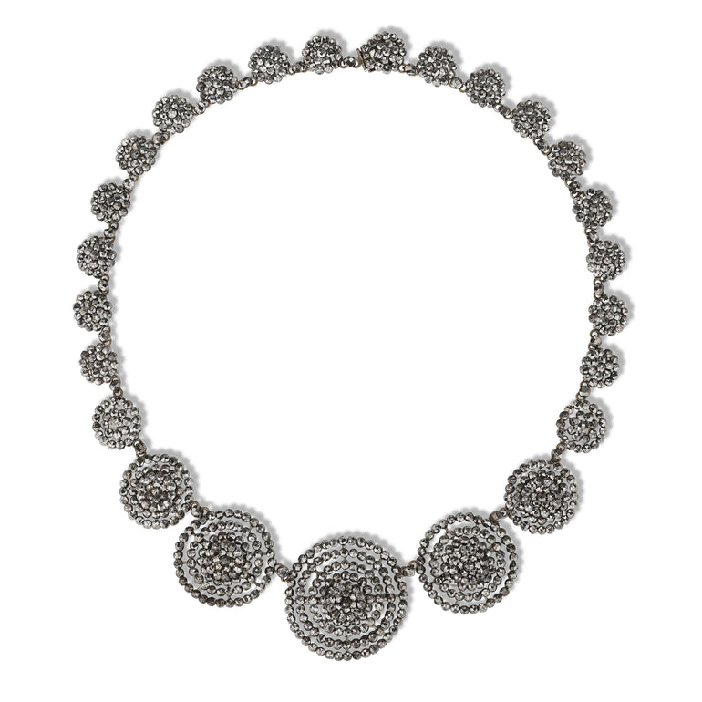 The graduation and proportions of this rivière are perfect! Each disc is formed of concentric circles, making it both geometrically pleasing and strikingly modern. This is the first cut steel rivière of this scale and design that Emily has found, and she loves how it relates so well to her modern designs.