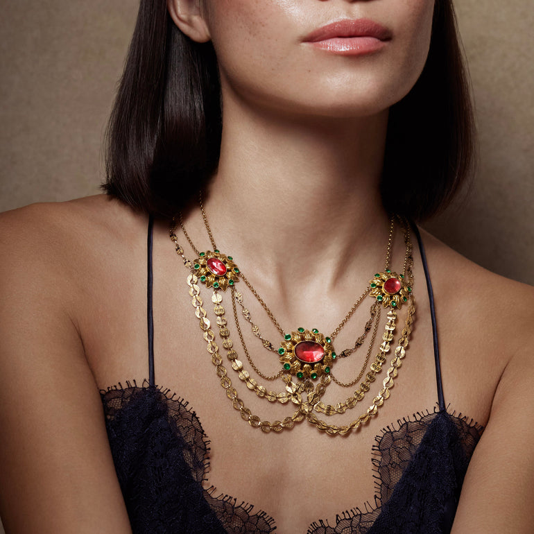 The idea of an esclavage began in Europe prior to the Empire period in France. In its simplest definition, it translates to a festoon necklace that usually supports three decorative stations. This style reached a height in the first quarter of the 19th century with the rise of the Empire period in France. Fashion preferred Classical references that included dresses with clean silhouettes, and deep necklines.