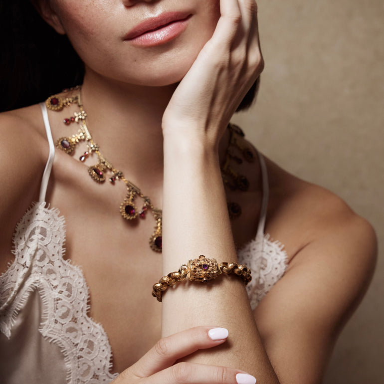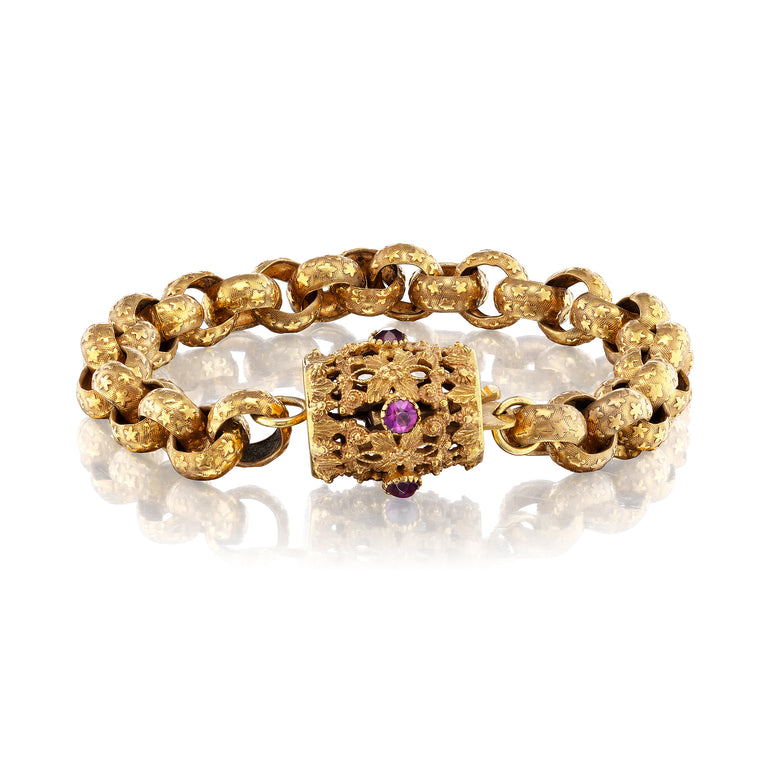 This bracelet is made from a lovely star-imprinted belcher chain, with a perfect barrel clasp set with purple paste stones. It is collectible and wearible– a winning combination!