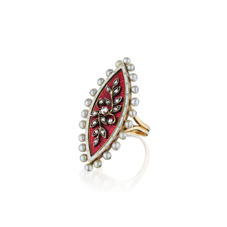 Translated from French, a navette is a small boat, a fitting name for the elegant and elongated shape that became popular in 18th century jewelry. This brightly enameled ring, neoclassical in style, packs a lot of detail into the design. The crimson enamel is translucent, revealing a pleasing texture that provides a lovely backdrop for the rose cut diamond floral spray, framed with precision by pinned seed pearls.