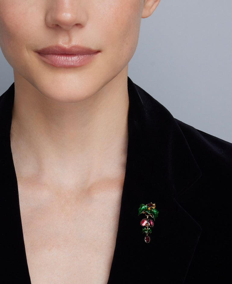 Stick pins were a part of a gentleman’s jewelry wardrobe in the Georgian era. This one, complete with its original coffin-shaped box, centers on cascading enamel ivy leaves and foiled garnets. Emily is always drawn to the hidden messages found within Georgian jewelry, and this small pin has a lot to say. Ivy symbolized eternity and endurance while garnets were code for love, romance, and protection while traveling. No doubt, this would make a poignant gift for a loved one who loves to time travel!
