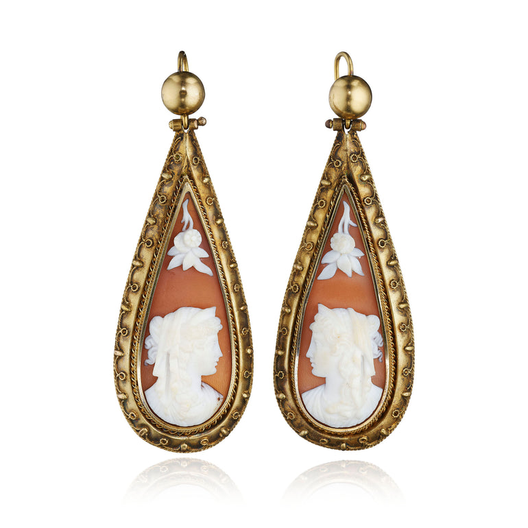 These earrings center on Demeter, the goddess of agriculture and vegetation; she is recognized by her personal attributes as well as the blossom that dangles above her head. A 19th century interest in Classical history and archaeology drove the urge to wear jewelry that honored the past and demonstrated intelligence. True to the Revival styles seen in goldwork, these shell cameos are framed by gold with an applied swag decoration. Elongated, and elegant, these earrings are so fun to wear.