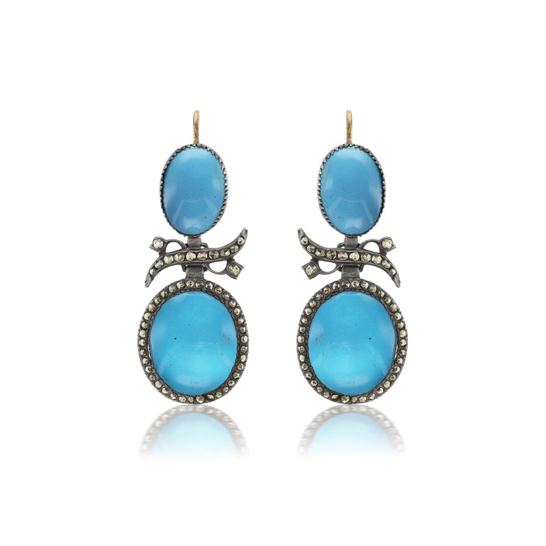 Beginning in the second half of the 18th century, double stone earrings became popular due to their ability to counterbalance the fashion for high hair and low necklines. Instead of sparkling stones, these earrings center on turquoise enameled ovals with delicate pyrites framing and playfully decorating each element. The materials convincingly convey a similarity to Persian turquoise and rose cut diamonds in their brilliant mix of color and sparkle.
