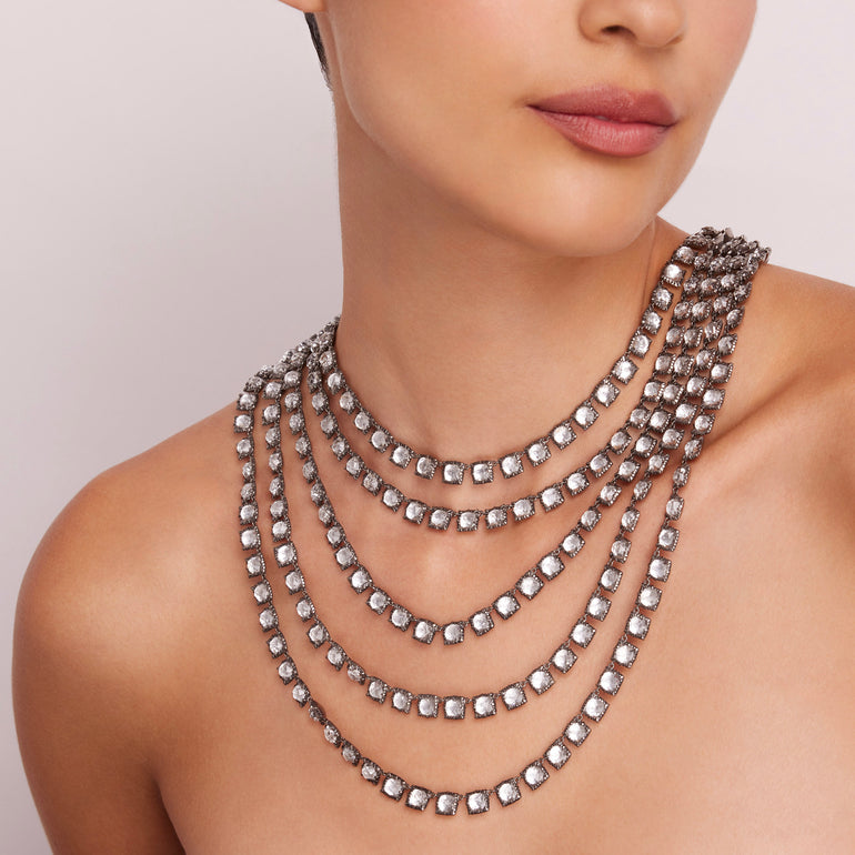 Named after Marie Antoinette, this five-strand rivière is certainly fit for a queen. Each rose-cut stone rests above a small piece of hand-cut foil that ensures the necklace will dazzle in candlelight, just as would have been the case when Marie Antoinette was queen.