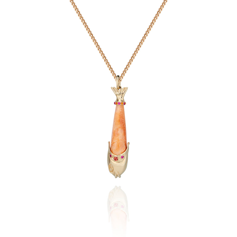 As an avid animal enthusiast, Emily designed a capsule collection dedicated to this love. Here is a delightful fish in the form of a pendant, meticulously crafted from spiny oyster shell and sapphires, and rubies.