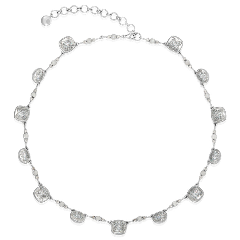 This piece combines the essence of a rivière and a necklace, offering the best of both worlds. The combination of white quartz, diamonds, and moonstones blends beautifully with the effervescent silver silk, with its flashes of rainbow hues, to enhance your radiance as you walk down the aisle and throughout your everyday life. For a demi-parure wear this with the matching double drop earrings and for a maxi-parure add the diamond choker, you're bound to fall in love.