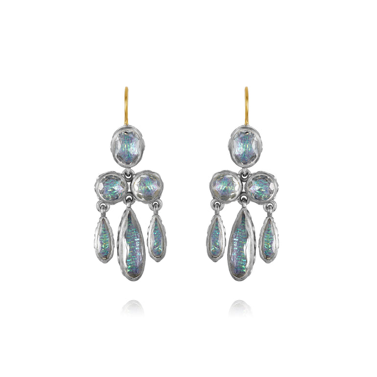 Girandole earrings have been the bridal earring of choice for over 200 years, no doubt due to the way the pear-shaped drops romantically twinkle in sunlight, moonlight and especially candlelight. Each setting is lined with one of three keepsake fabrics: a creamy, white silk satin bouquet ribbon, offering an alternative to wedding pearls, a mesmerizing pale blue opalescent fabric for a little something blue, or a luxurious silk tulle fabric that complements a wedding veil. These earrings will forever remind you of your wedding day as you continue to wear them for both everyday occasions and significant milestones throughout your lifetime.