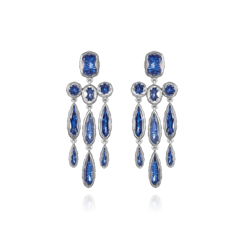Our long girandoles double-up on pear shaped stones, providing extra movement and sparkle, reminding us of the crystal chandeliers that gave them their name over 200 years ago. Each setting is lined with one of four keepsake fabrics: a mesmerizing pale blue opalescent fabric for a little something blue, a creamy, white silk satin bouquet ribbon offers an alternative to wedding pearls, a luxurious silk tulle fabric that complements a wedding veil, or a deep, shimmering blue lamè chosen with the after party in mind. These earrings will forever remind you of your wedding day as you continue to wear them for both everyday occasions and significant milestones throughout your lifetime.