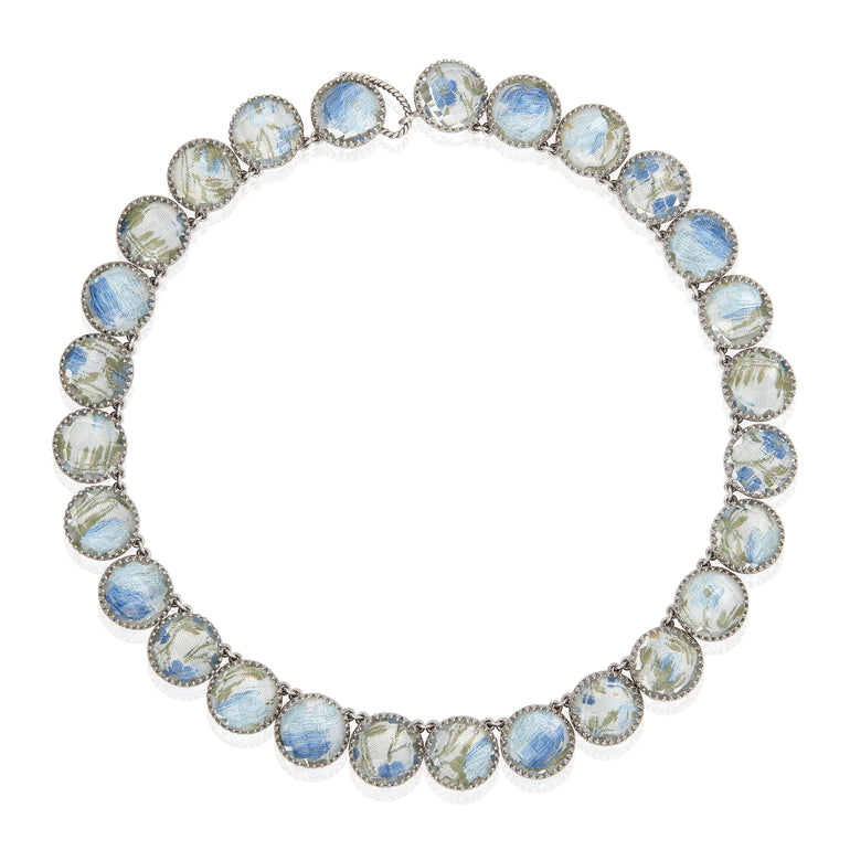 This rivière is our most iconic and as such, Emily thought long and hard about how to make our bridal rivière extra special. We celebrate her by lining her settings with this romantic, vintage embroidered French ribbon. In addition to being beautiful, our Garland ribbon can be your something blue and features forget-me-not flowers, which were emblematic of romantic sentiments during the Georgian era. This is a heritage piece that can be worn formally, informally, reversed to show its arbor-engraved settings, or matched with earrings for the perfect suite.