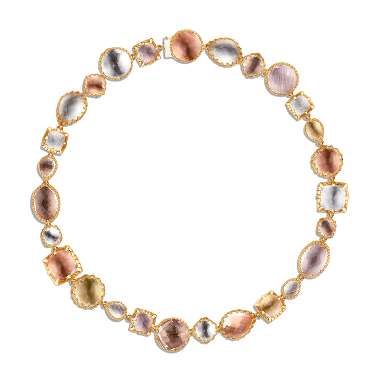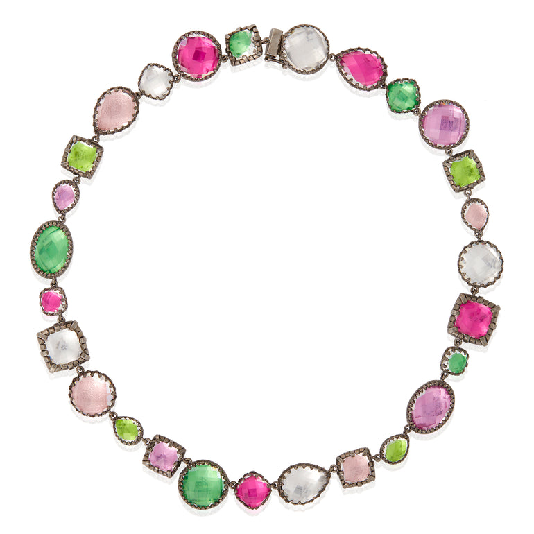 Bold, irreverent, eccentric — Sadie plays by her own rules, juxtaposing shapes and colors to brilliant effect. The Sadie collection was one of Emily's favorite to design since she combined classic settings and cuts in a novel way, allowing her to create something totally unique. The whimsical stone layout allows strong and soft colors to live harmoniously together without ever overpowering. Find the Small Sadie Rivière here.