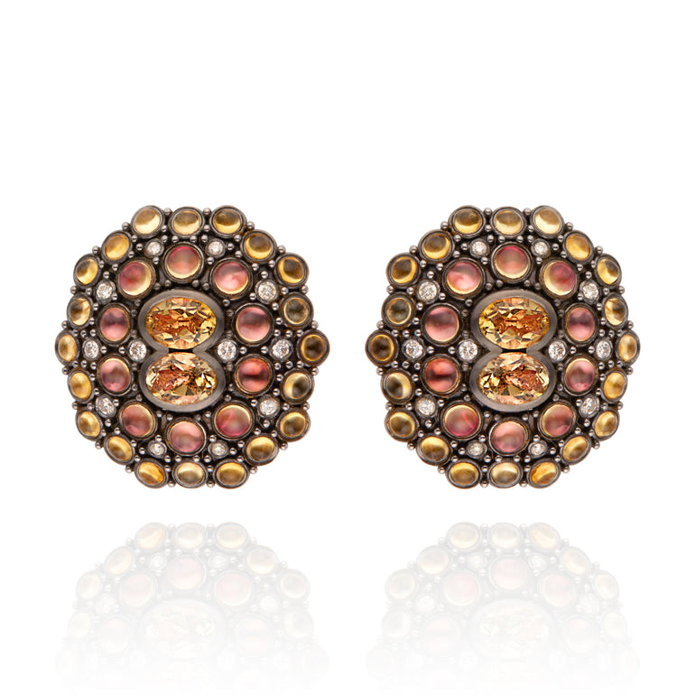 Here we have the most ambitious cluster earring in the Larkspur & Hawk collection. Touting 88 stones per-pair, these earrings pay homage to the meticulous craftsmanship of 18th century Portuguese goldsmiths, who were masters at setting a multitude of stones in almost invisible silver settings. Notice the combination of cabochon and faceted stones offering a unique play of color and light that is accentuated with every movement.