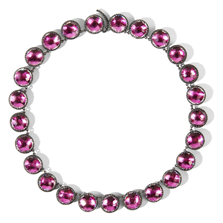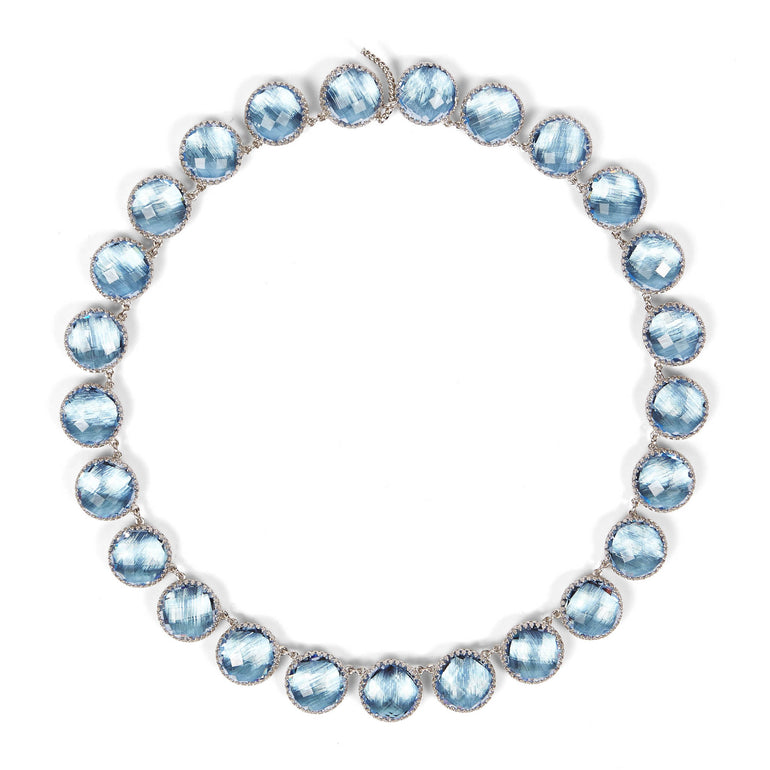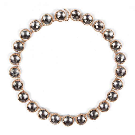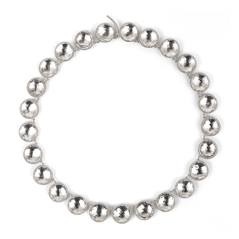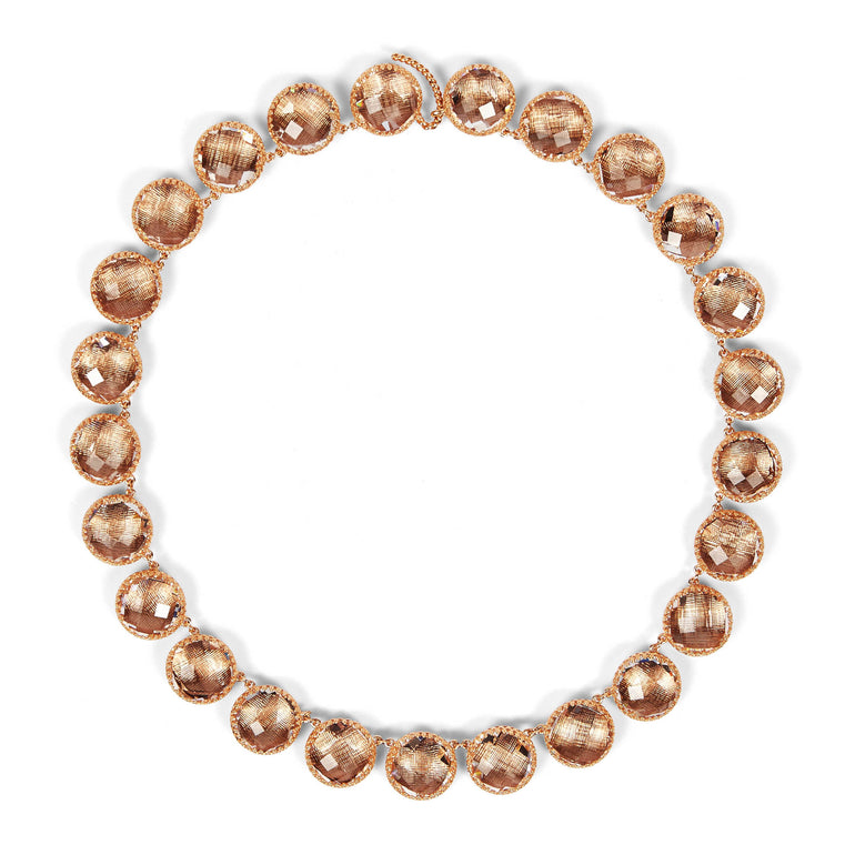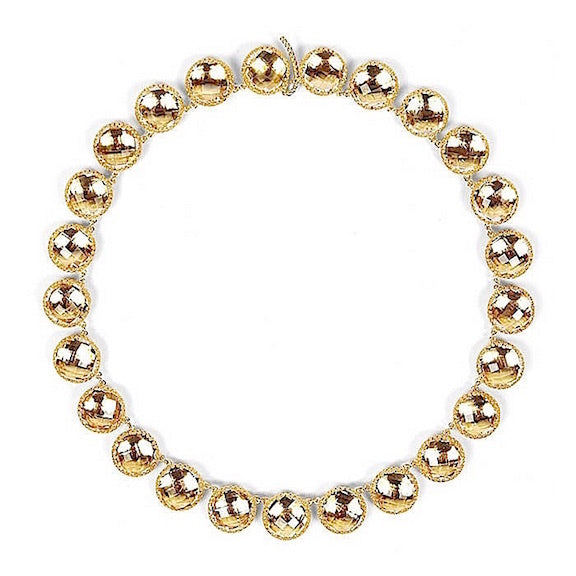 Literally defining rivière, when worn, this glistening piece was designed to resemble a sparkling river flowing around the neck. Rivières have added joy to generations, endured changing fashion, and today, they are at home with both formal and informal attire. For a statement, wear more than one and don’t forget to reverse it to highlight its beautiful arbor-patterned setting.