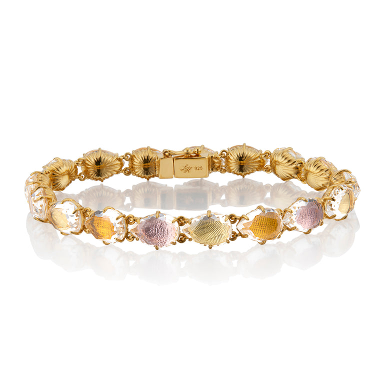 Our delicate Caterina settings and pear-shaped stones provide the perfect platform for color gradients. The gentle hue changes ripple around the wrist, like sunlight reflecting on a river of stones. Find the matching rivière here.