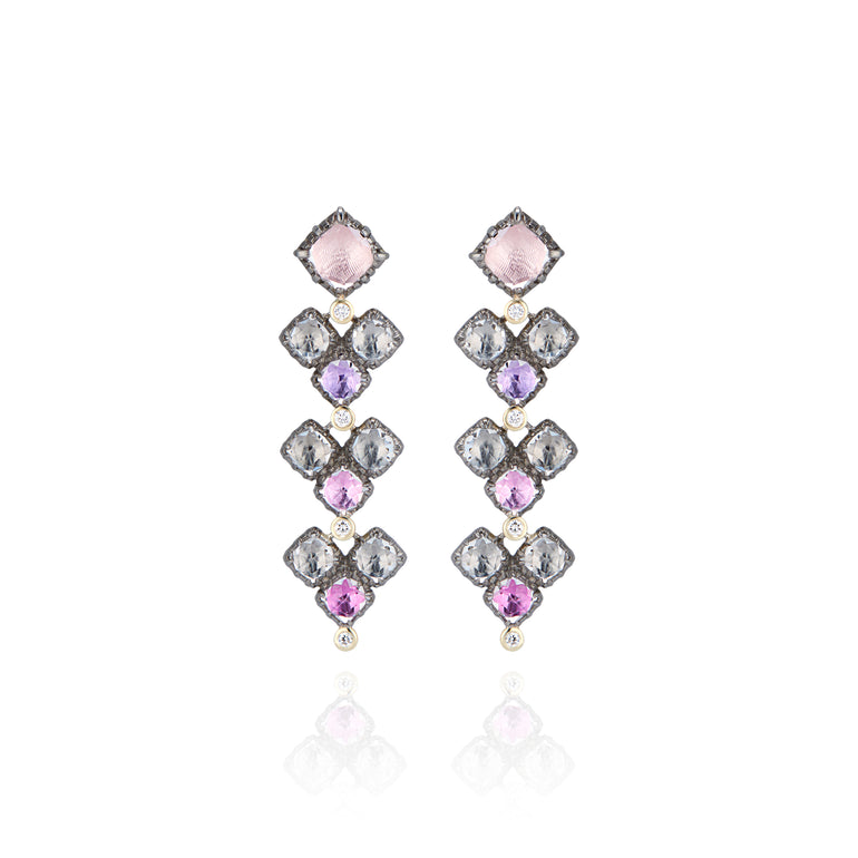 Emily loved the layout of these 3 clustered cushion-cut stones so much, that she wanted to pay homage to them. Here they are stacked with a diamond in between each cluster and a gradient color plan, further enhanced by their gentle movement.