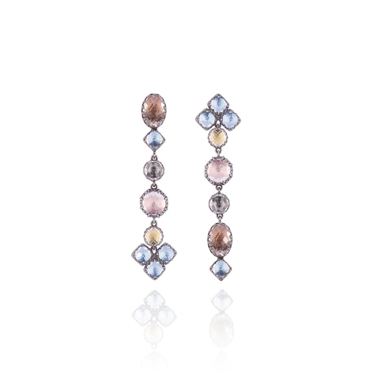 Long and lean, this asymmetric earring is perfect for a soft color palette. The closer you look the more detail you will see. Simultaneously modern and old world, the layout and settings are playfully mismatched.