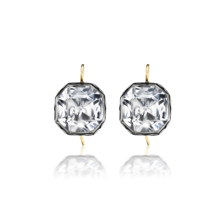 These are the quintessential button earrings that belong in any antique jewelry collection. So easy to wear, they are a literal glossary of 18th century characteristics; foiled and faceted hexagonal-shaped white quartz set with collets that can almost light up a room with their sparkle. Starting life as gentleman's waistcoat buttons or cufflinks, they were cleverly turned into earrings once fashion no longer favored jeweled buttons. These are the kind of earrings that inspired Emily to design her Luzia Button earrings, so she is delighted to find a perfect antique example to be part of her curation.