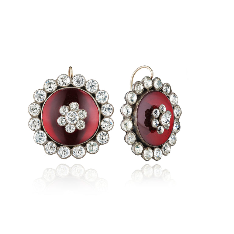 These earrings, dating to the early Victorian period, are a design popularly used with cobalt glass, but are particularly noteworthy for their currant color. The translucent glass glows from all angles and is further enhanced by a white paste frame and applied flower.