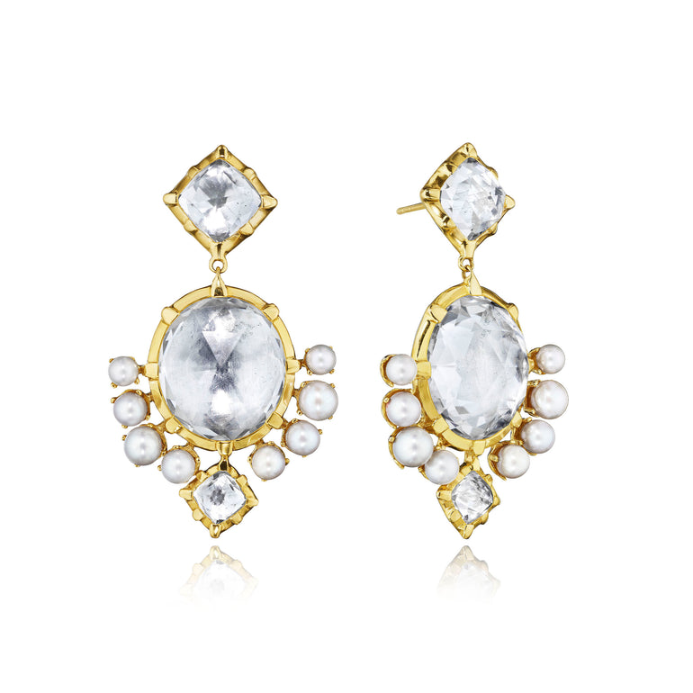 The Bella Compass Earrings embody a harmonious blend of classic refinement and modern sophistication. Inspired by the enduring elegance of antique jewelry, these earrings reinterpret timeless design through a contemporary lens. Crafted in 14K yellow gold, each earring features luminous grey pearls paired with radiant white quartz, subtly enhanced by our signature white foiling technique—a nod to the artistry of Georgian-era craftsmanship.