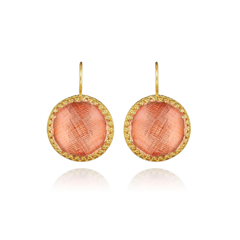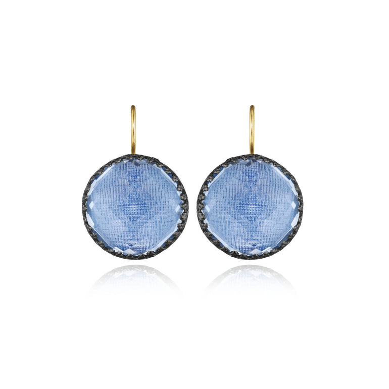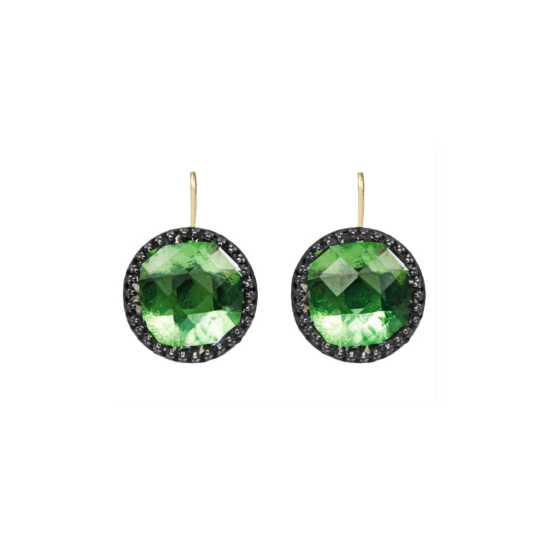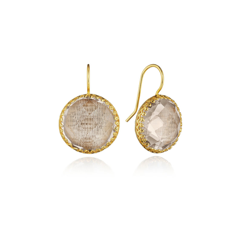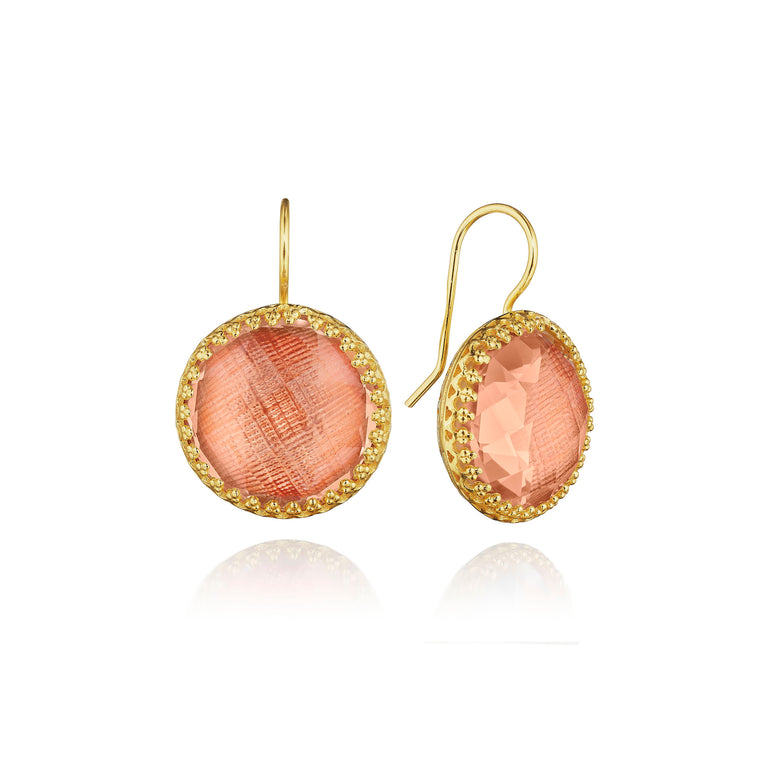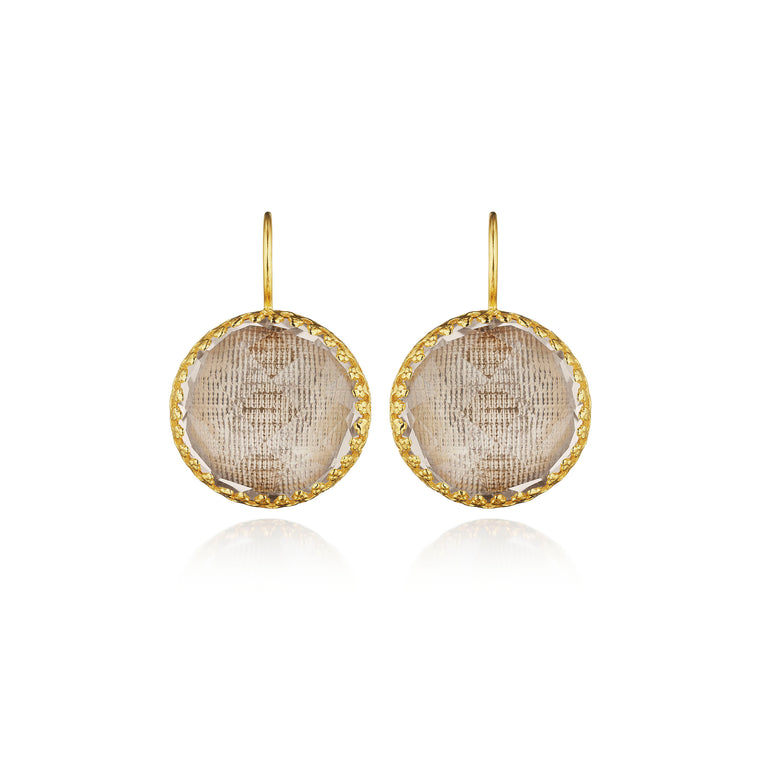 The Olivia Buttons take their inspiration from 200-year-old gentlemen’s waistcoat buttons, beautifully colored with metallic foils and decoratively backed with engraved settings. One of Emily’s first designs, these earrings have remained our most popular, with a wide-ranging fan-club.