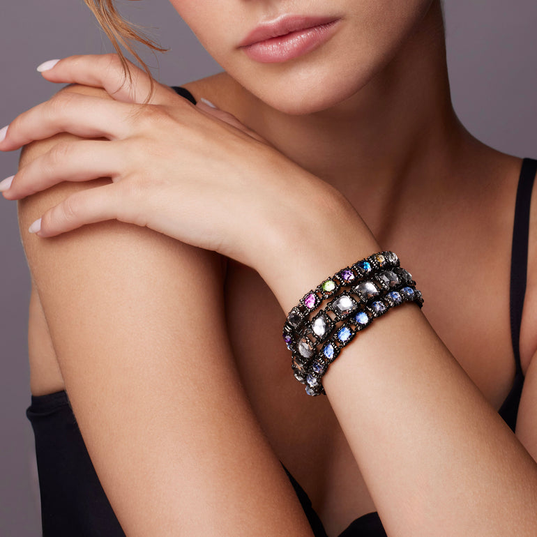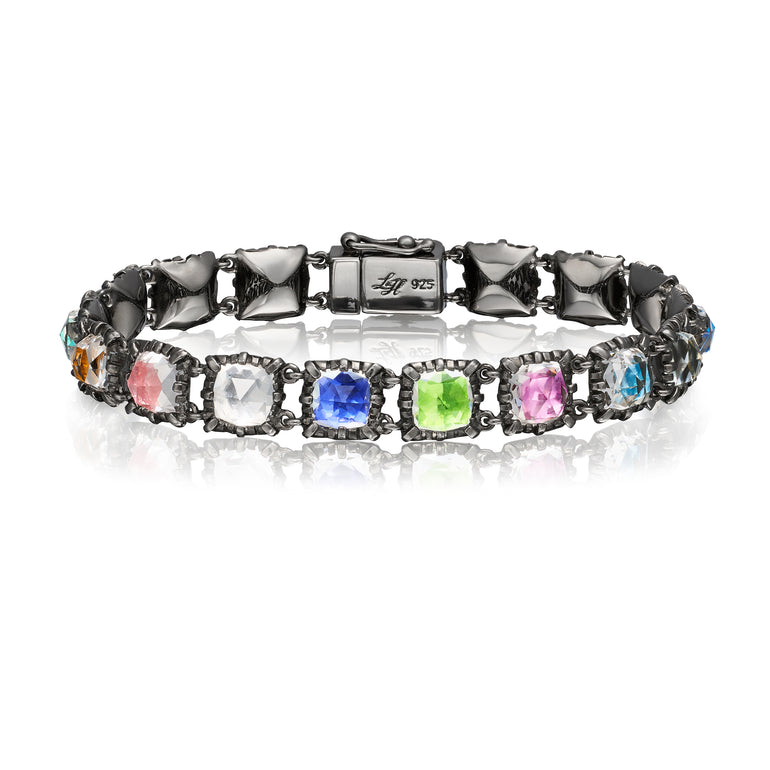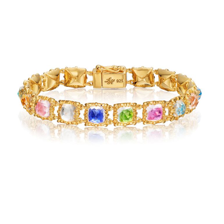 The Palette Small Jeu de Paume Bracelet transforms one of our most popular designs into a vibrant celebration of color. This limited edition piece showcases foiled rose-cut stones in antique-inspired collet settings.