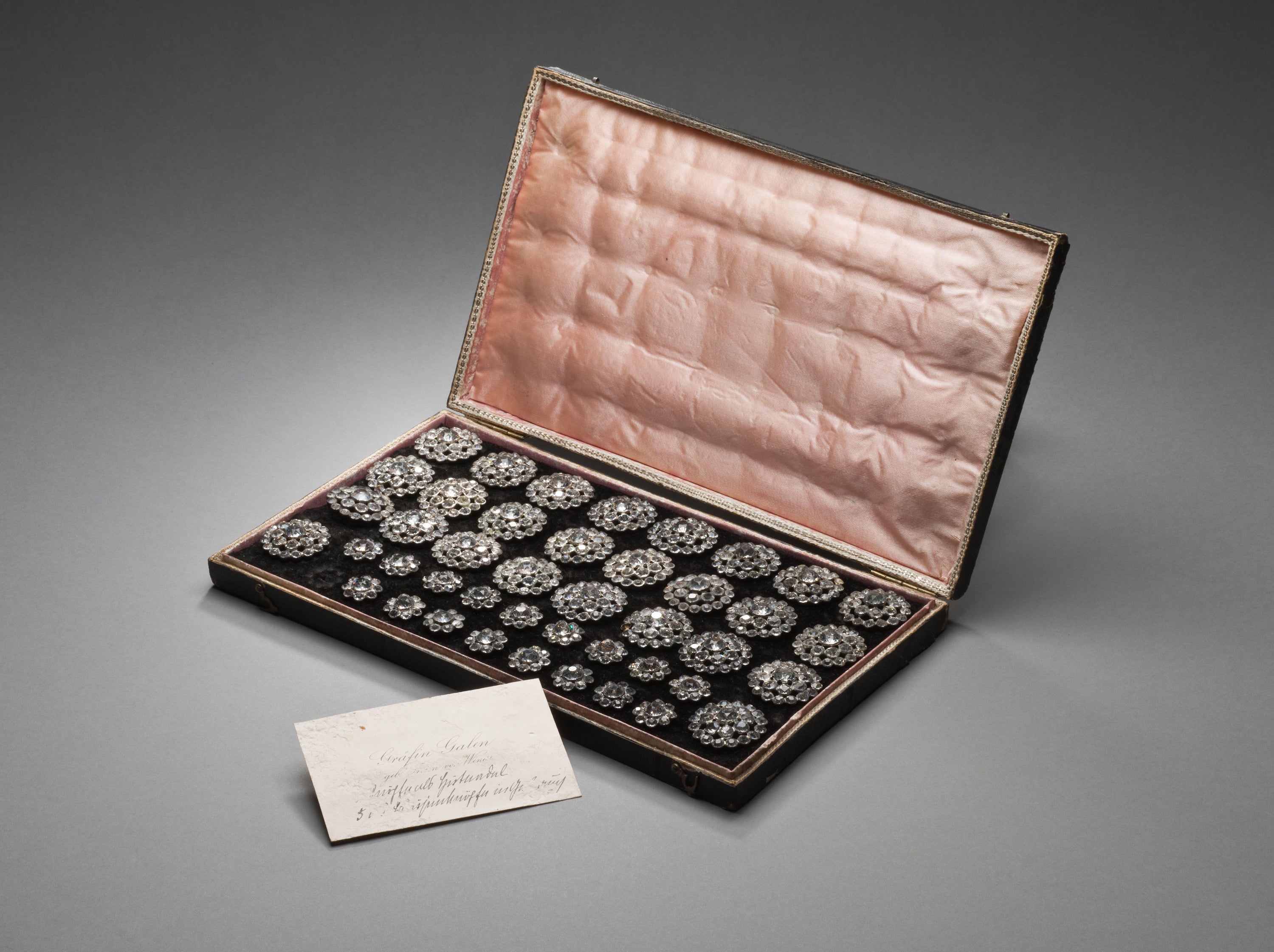 Exceptional set of foiled paste men's coat and waistcoat buttons in their original box.