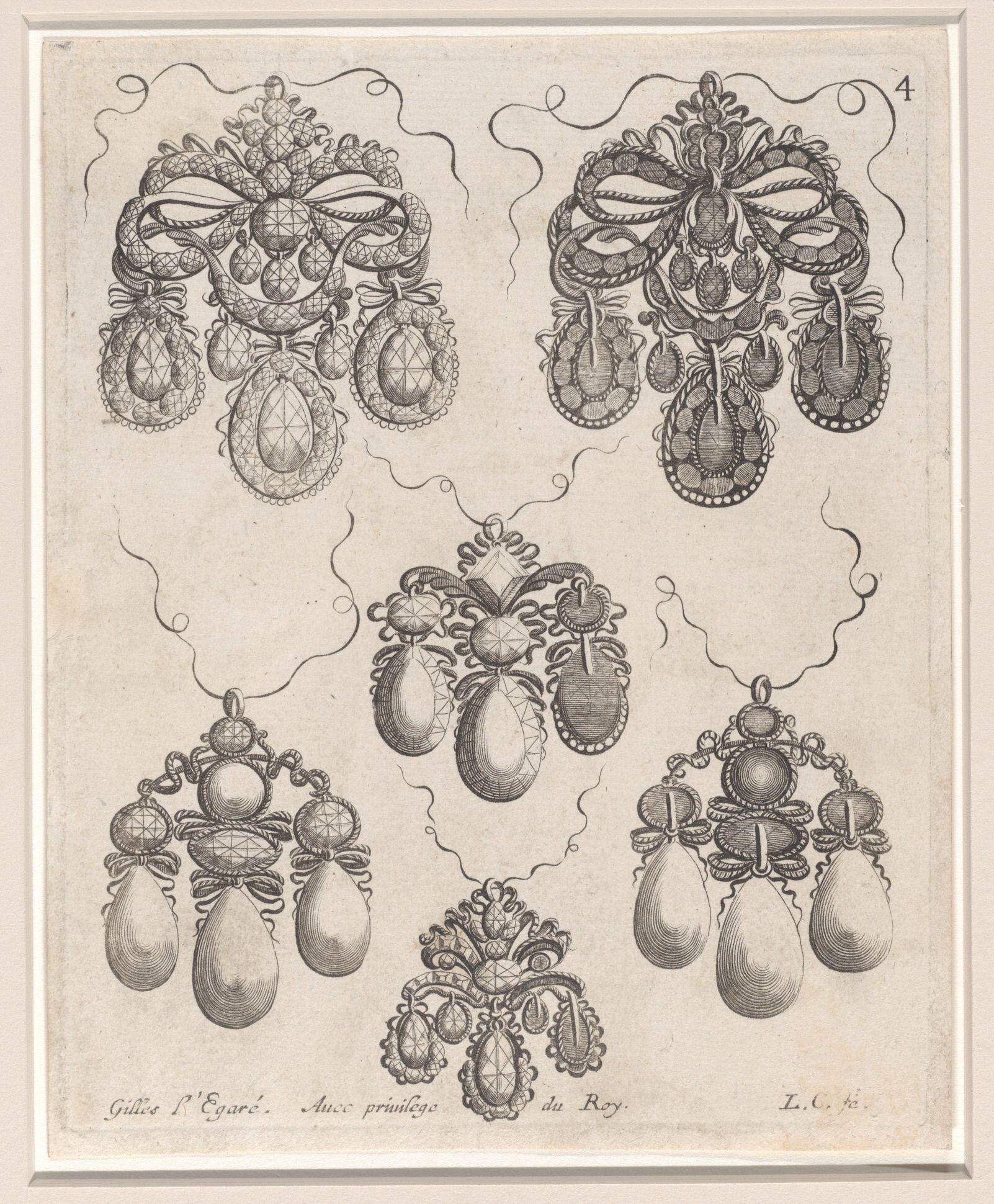 Note the removable drops in this early 17th century sketch of pendants, allowing them to convert from day to night.