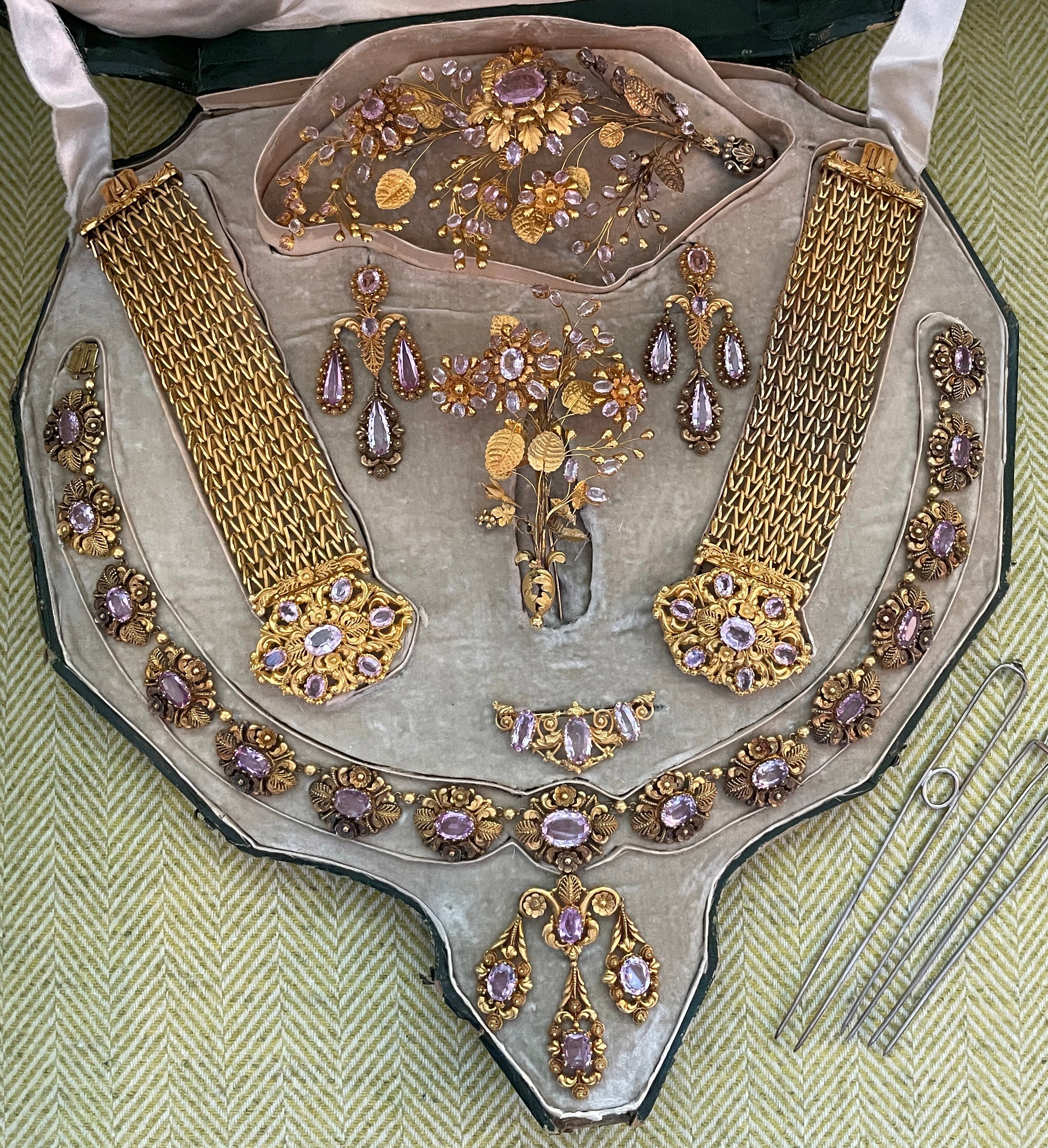 Parures have come to define a matching suite of jewelry that most completely could include: earrings, bracelets, statement necklaces, diadems, aigrettes, and even buttons. Most common were demi-parures (small suites) that were generally composed of a pair of earrings and a necklace. These sets would have started life being housed in custom-fitted boxes, that when found today, continue to dazzle and delight!