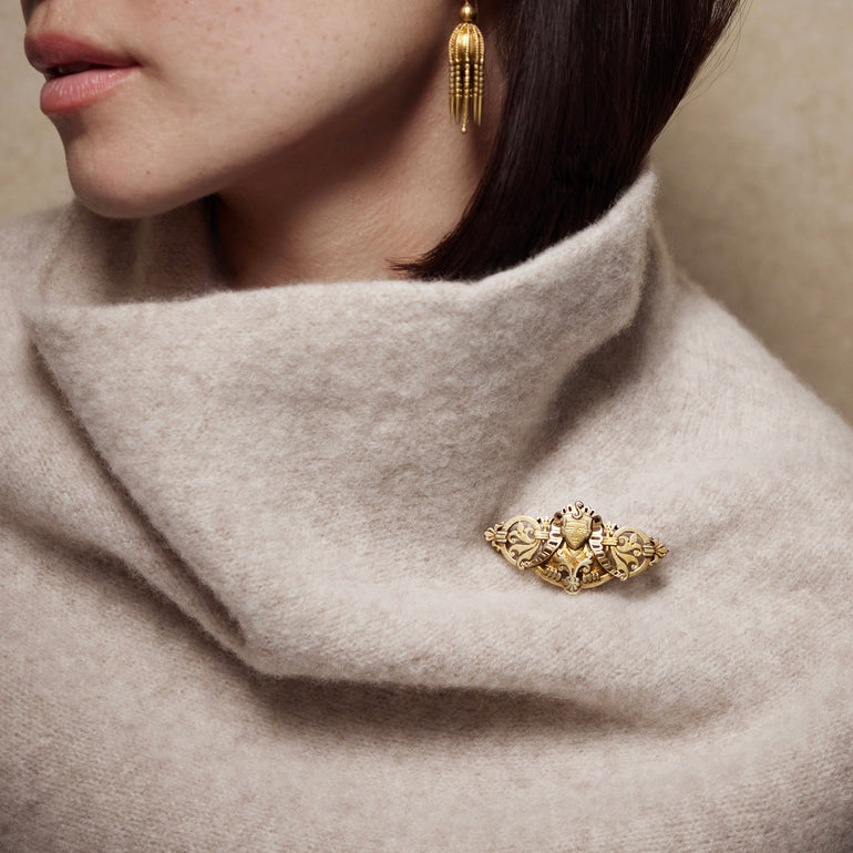 This brooch fits this vernacular to a T! The Pharaoh’s mask takes center stage, placed among various Egyptian-inspired elements that might have been borrowed from hieroglyphs. The cold color is richly warm and the scale is perfect for so many applications.