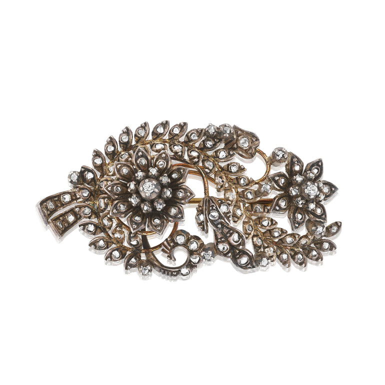 The love of nature continued in the Victorian era and so did trembling jewels. People loved the way the stones sparkled in candlelight, almost as though a gentle wind caused the movement. This brooch fits into that aesthetic and the old mine cut diamonds are set in silver with a gold washed back. The two flower heads tremble and the overall design is so lovely.