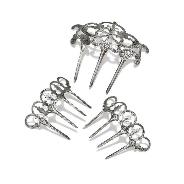 This dramatic silhouette was perfectly suited for the high buns and long hair popular in Victorian England. Perhaps, the smaller combs were for daytime use and the large was reserved for evening soirees, either way the set of three leaves us with endless possibilities.