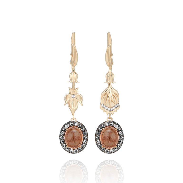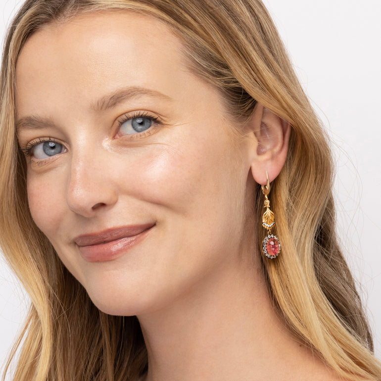 Inspired by 18th century botanical prints, Emily designed these one-of-a-kind Posy earrings with mismatched flowers that suspend clusters of cabochon pink tourmalines and pavè diamonds, which are beautifully backed in our signature Arbor eyelet gold pattern. The closer you look, the more you will be delighted.